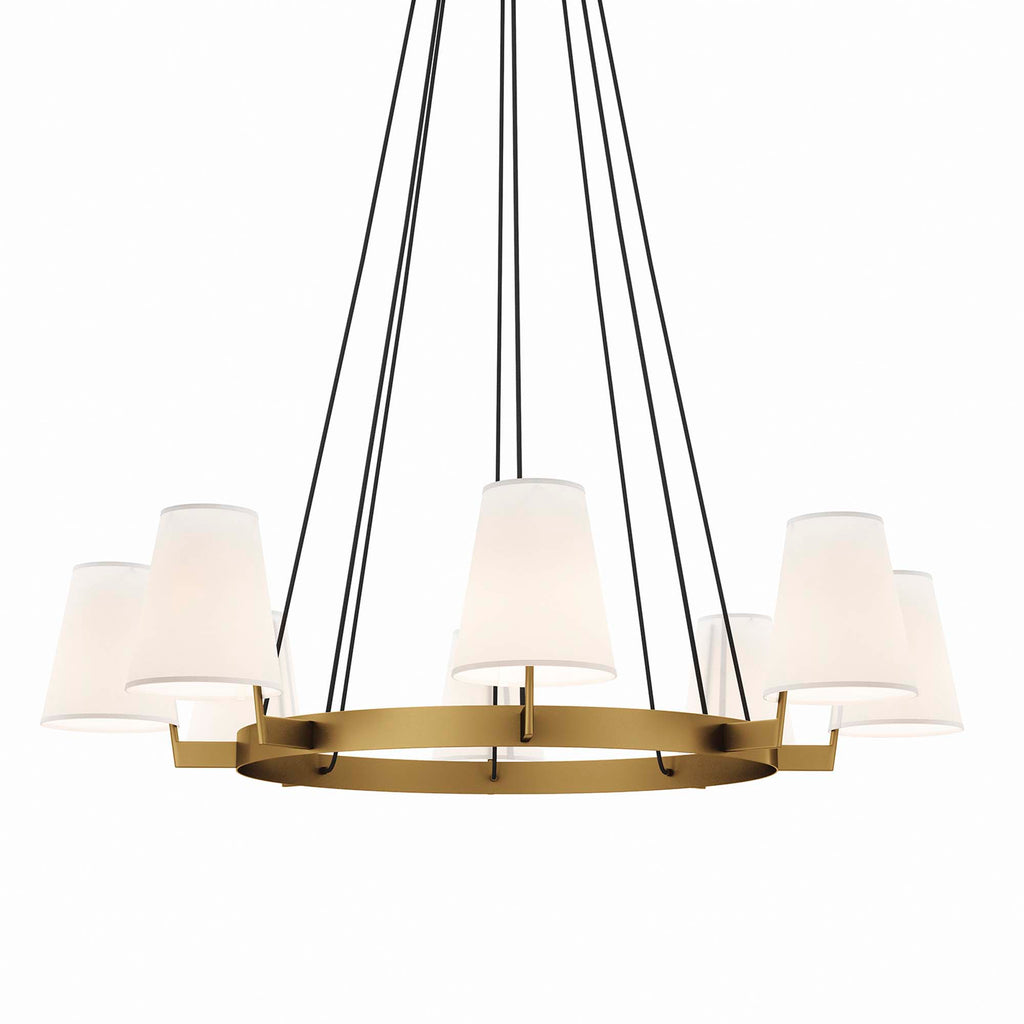 Cover your living space in a peaceful illumination from the Surround 8-Light Chandelier. Designed to light up the living room, kitchen, dining room, bedroom, or entryway, this pendant light features a circle of eight fabric cone shades and is suspended by eight height-adjustable cables making it customizable to a variety of ceiling heights. Surround is compatible with sloped ceilings. This pendant chandelier requires professional installation and eight E26 bulbs 60W max or LED equivalent (not included). ETL Listed for Damp Locations. Luminaires that are “Suitable for Damp Locations” are approved for areas that are regularly exposed to moisture and condensation.