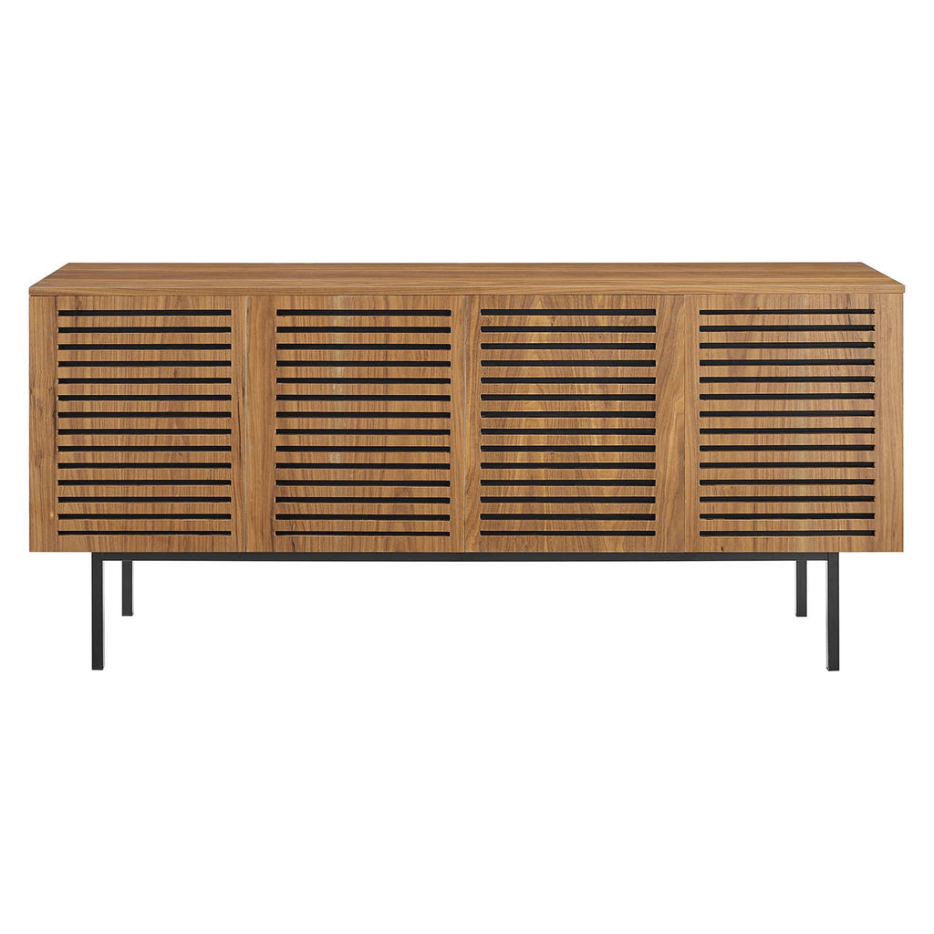 Redefine your living space with the Parker TV Stand. Featuring a beautiful design and organic aesthetics, this wooden TV stand brings stylish functionality to the living room, bedroom, and home office and its versatility allows it to double as a credenza, sideboard, buffet, or display stand in the dining room or entryway. Parker is crafted with MDF with walnut wood veneer and rests on powder-coated iron tube legs. Featuring a breezy design for flow-through ventilation, this TV stand is complete with adjustable-height shelves, anti-toppling straps, a cable management hole, and sliding doors that make up the back panel that also remove completely. The front doors of this media console feature soft-close hinges. Keep visual space clean with the ample storage space for media essentials with this TV stand that accommodates flat screen TVs up to 75".